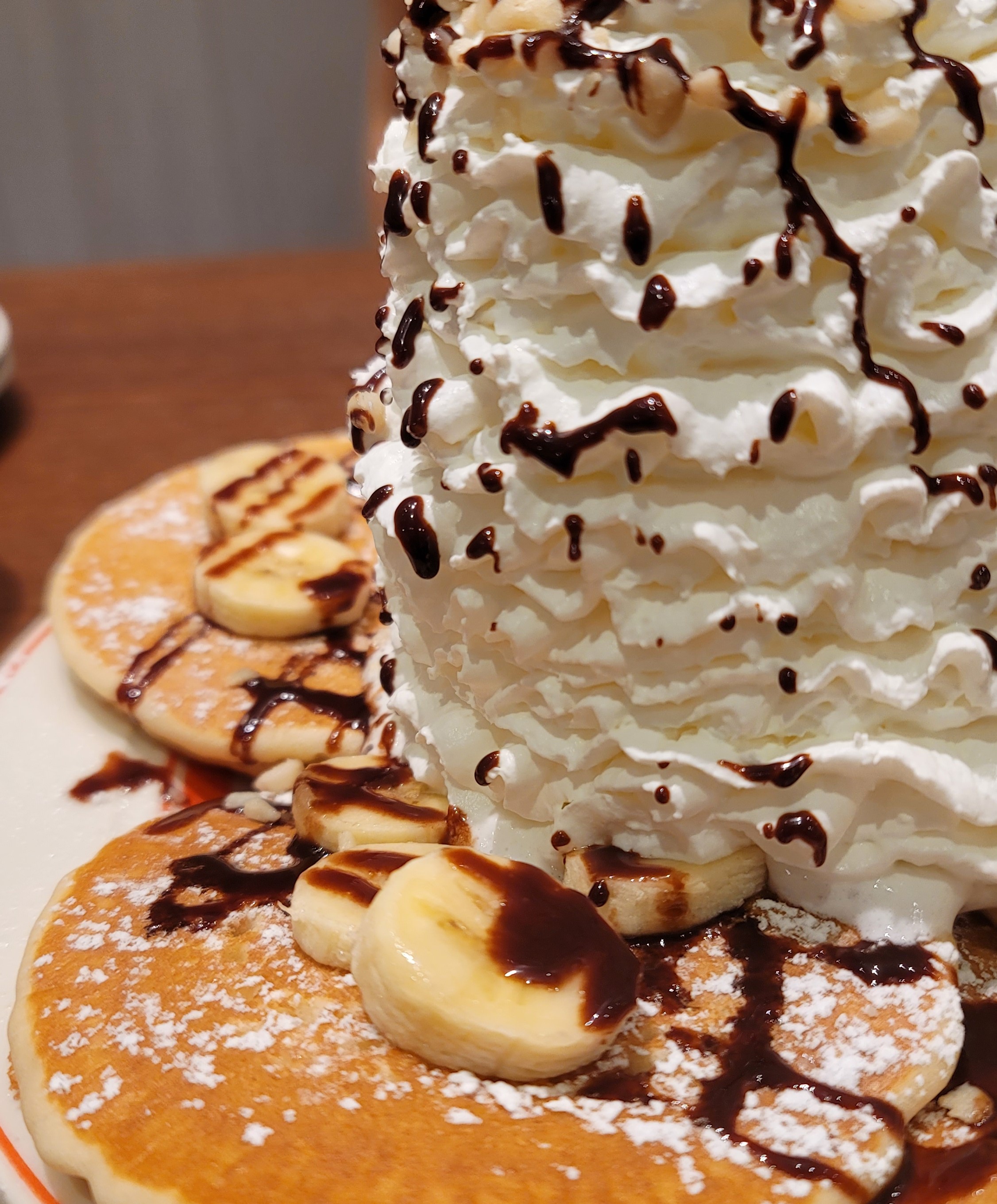 数ヶ月前に行った時は長蛇の列で入店諦めましたが、今回はすこし落ち着いたのかスムーズに入店出来てお目当てのメニューにありつけました。画像はパンケーキ(チョコバナナのトッピング)でホイップの量が半端ない感じ。味の感想はズバリウマイ!マカダミアナッツのチップもまぶされていて食感も楽しめホイップもむつこくなくすべて完食できました。